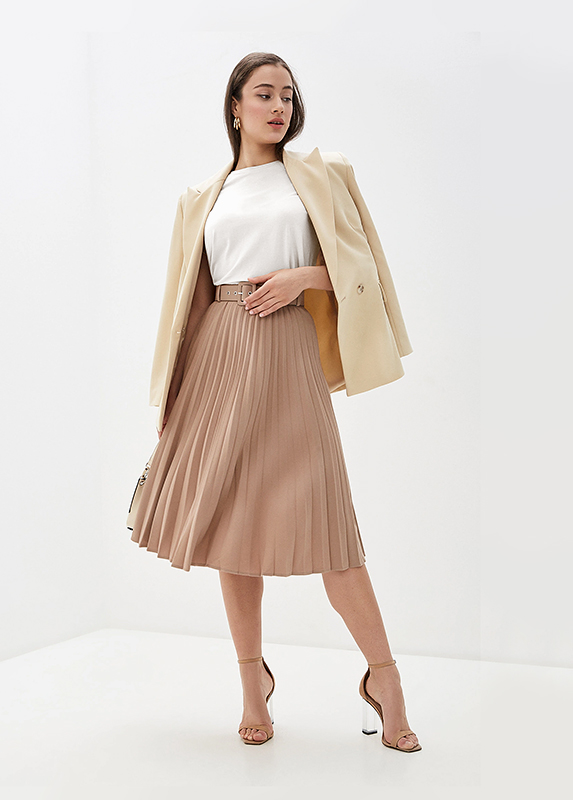 Плиссированные юбки не оставят равнодушных: носите их в теплое время года с босоножками и топом, а в холодное — с ботинками и свитером oversize. Универсальный элемент гардероба сочетается с майкой на тонкой бретели и с каблуком средней высоты. Дополняйте образ аксессуарами.